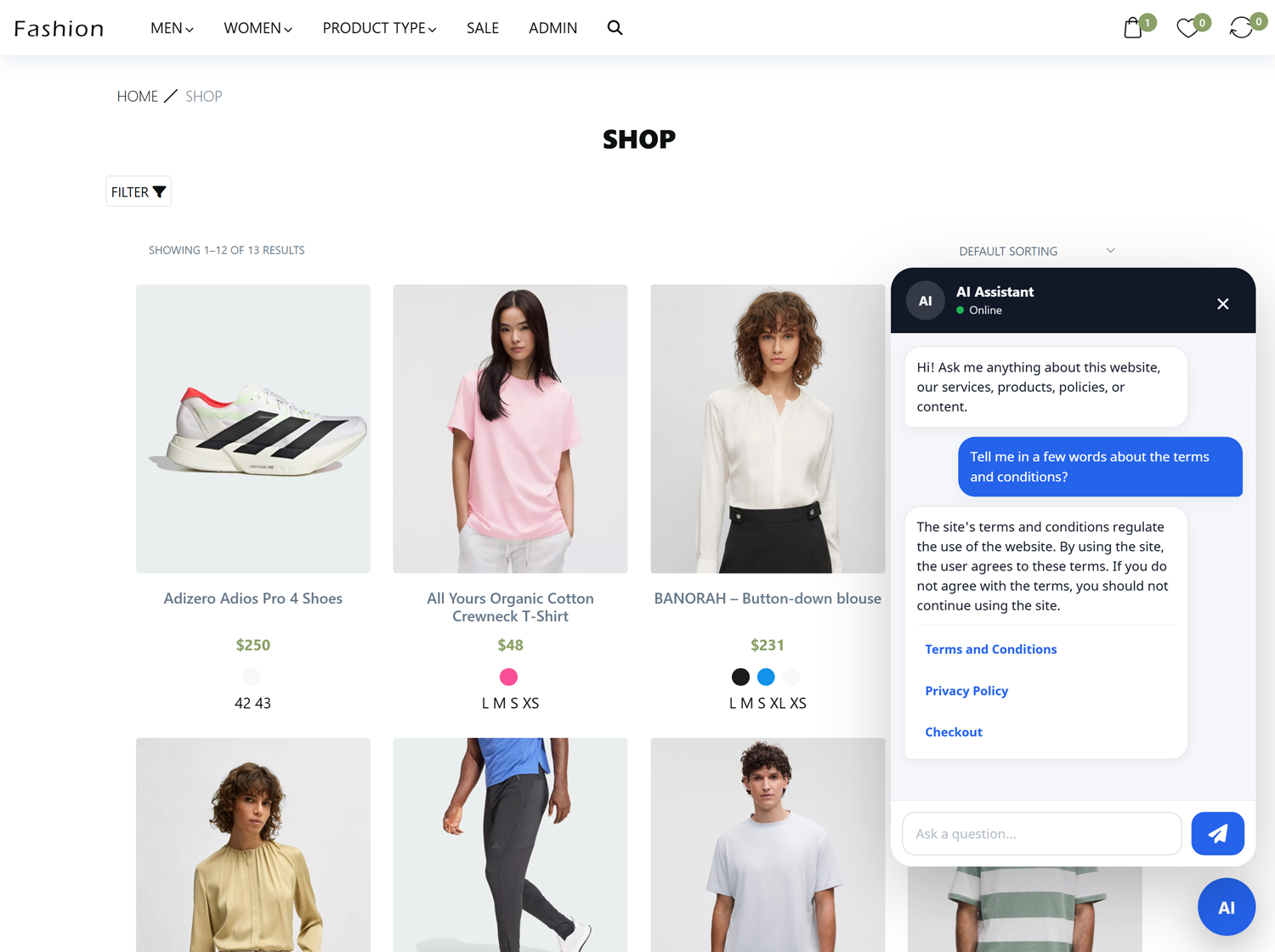 When WooCommerce products are enabled for indexing, the chatbot can help visitors: